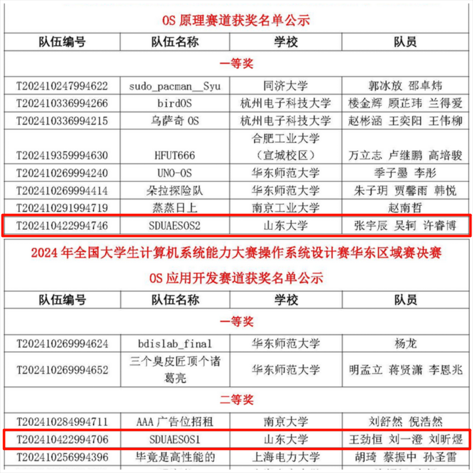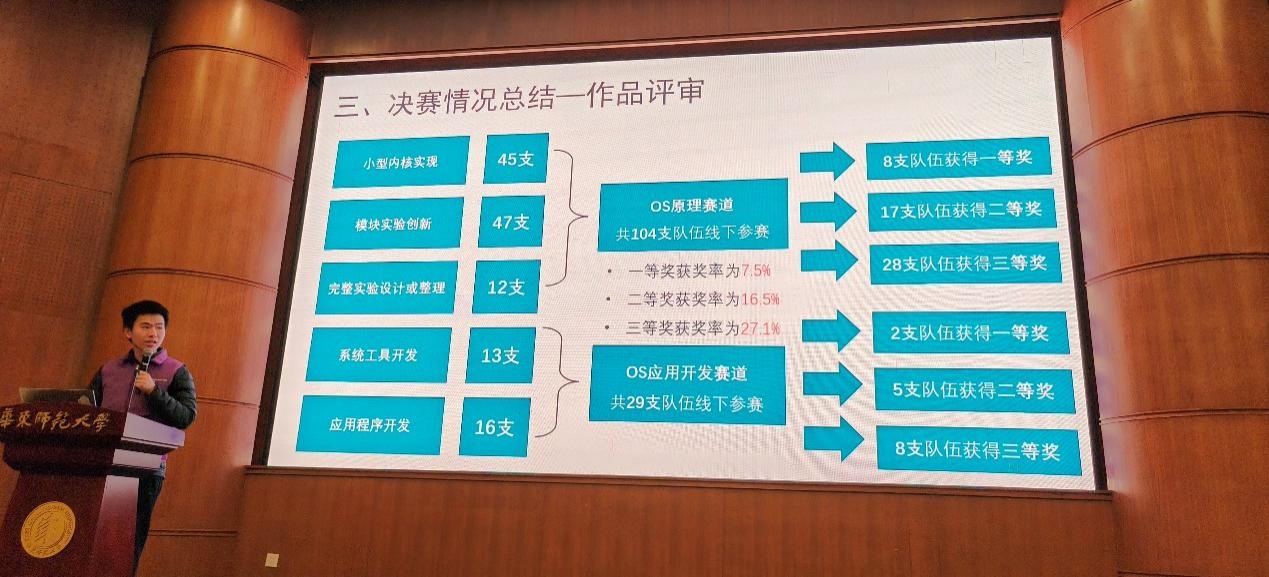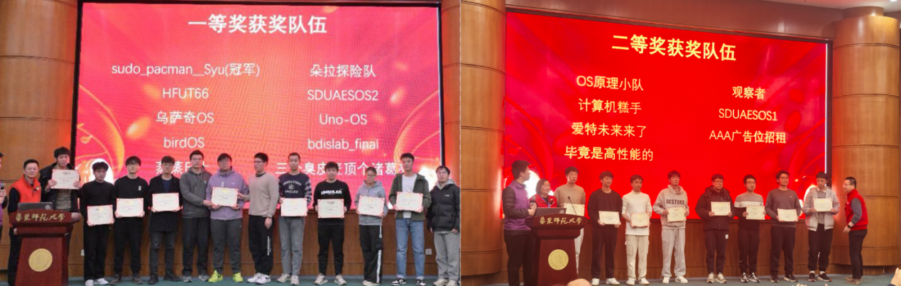 1月12日,全国计算机系统能力大赛操作系统设计赛华东区域赛在华东师范大学普陀校区落下帷幕。自2024年10月25日比赛信息发布后,包括复旦大学、南京大学、中国科学技术大学、同济大学和厦门大学等300余支参赛队伍进行了激烈的角逐,有135支队伍入围决赛。决赛以“成果展示+答辩”模式进行,一等奖占全部决赛队伍的7.5%,二等奖占比为16.5%,三等奖占比为27.1%。最终,来自山东大学计算机学院体系结构与嵌入式系统研究中心的团队SDUAESOS2获得一等奖,团队成员由本科三年级学生张宇辰、许睿博、吴轲组成,团队SDUAESOS1获得二等奖,团队成员由本科三年级和二年级学生刘一澄、王劲恒、刘昕煜组成,两支队伍的指导老师为贾振格教授。